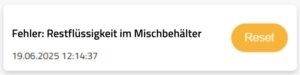 Der Fehler „Flüssigkeitsrückstand im Mischbehälter“ zeigt an, dass sich noch Flüssigkeit im Tank befindet, was zum Stopp des Geyser Pro führt, bis das Problem behoben ist. Der Fehler wird in der WebApp angezeigt, begleitet von einem Signalton und folgenden Anzeigen: LED 1 dauerhaft rot, LED 4 ebenfalls dauerhaft orange🟠⚪⚪🔴