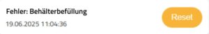 Der Füll-Timeout-Fehler tritt auf, wenn der Füllstandssensor im Mischbehälter nicht erkennt, dass der Wasserstand innerhalb der vom System festgelegten Zeit (120 Sekunden) erreicht wurde. Dieser Fehler wird in der App mit der Meldung „Fehler: Tankfüllung“ angezeigt und durch LED 1 und LED 2 dauerhaft Rot ⚪⚪🔴🔴 sowie ein akustisches Signal (Beep) gemeldet.