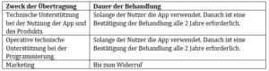 Die Dauer der Verarbeitung Ihrer Daten ist wie folgt: