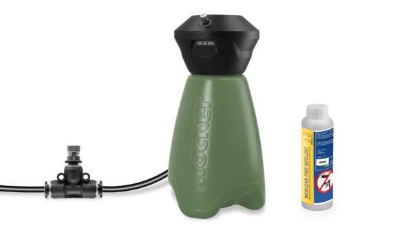 Das Kit enthält den Nebulisator, die Flüssigkeit Nebuzan Free, einen 10 m langen Schlauch mit einem Durchmesser von 6 mm, Düsen mit ultrafeiner Nebelstrahlfunktion, einen Stöpsel mit einem Durchmesser von 6 mm, einen T-Schlauchanschluss und eine Schlauchbefestigung mit einem Durchmesser von 6 mm für Geyser.
