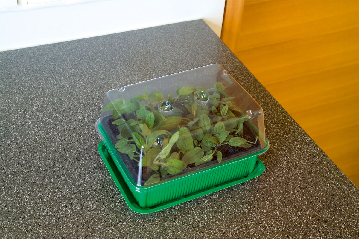 Treibhaus mit Topfplatte für optimale Jungpflanzenaufzucht. - Dank geringer Breite ideal für Fensterbänke - Inklusive transparenten Plastikdeckel - 12 Kunststofftöpfe - Größe: 20…