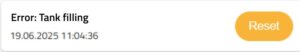 The filling time-out error occurs when the level sensor in the mixing tank does not detect the water reaching the required level within the time set by the software (120 seconds). This error is shown in the app with the message “Error: Filling tank” and indicated by LED 1 and LED 2 solid red ⚪⚪🔴🔴, along with an error beep.