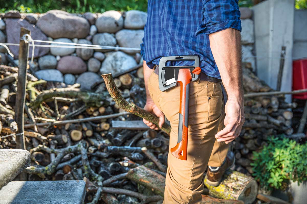 The 500 g cutting-head is made form high-carbon steel of top quality and an anti-friction coating. Thanks to its shape and the non-slip material, the handle is ergonomic and light: its structure is empty inside to reduce the vibrations caused by the impact with the wood. The back side of the cutting-head is also usable as hammer. The ax is equipped with a cover with belt-loop, for an easy and safe carriage of the tool.