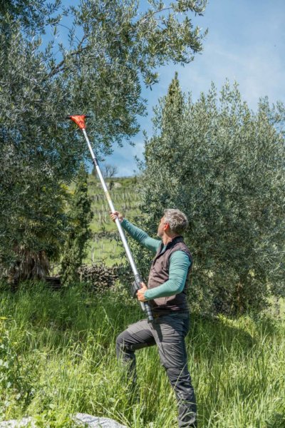 The telescopic harvester 235-315 Magma E-51 21 V is an extension of the Magma 21 V line to meet the need for olive harvesting. The fan-shaped movement and vibration of the rods are designed to preserve the vegetation and to avoid dispersal of the crop. It offers a working range of 51 cm thanks to its 8 carbon rods and two working speeds: 1.050 and 1.200 rpm which give the possibility to harvest up to 120 kg/h of olives. Its adjustable length from 235 to 315 cm facilitates harvesting up to 4.5 m.