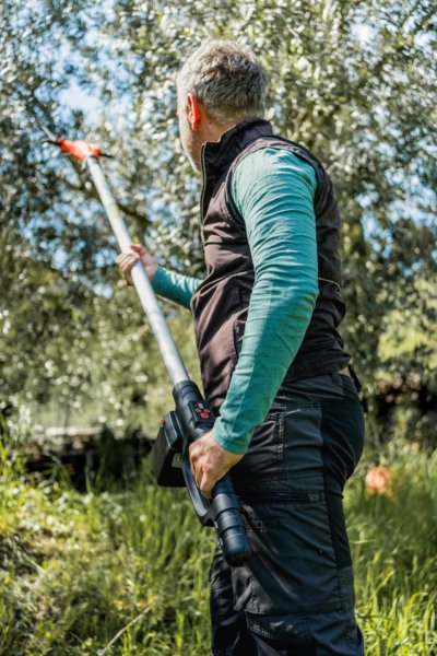 The recommended battery for this product is 8 Ah / 21.6 V. This battery allows continuous work of up to 140 minutes with power level 2. The telescopic aluminium handle is strong, light and well balanced. The battery compartment is located at the base, with a fast click-in system.