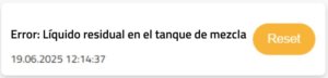 El error “Líquido residual en el tanque de mezcla” indica que ha quedado líquido en el tanque, lo que provoca el bloqueo del Geyser Pro hasta que se resuelva el problema. Este error se muestra en la WebApp, acompañado de una alerta sonora y los siguientes indicadores: LED 1 en rojo fijo y LED 4 también en naranja fijo 🟠⚪⚪🔴