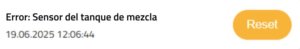 Causas posibles: el sensor de nivel del bidón de mezcla puede estar desconectado o defectuoso. El Geyser se bloquea porque no puede realizar correctamente los cálculos y verificaciones de llenado. Si el problema persiste, contacta con tu distribuidor para sustituir el sensor.