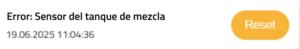 Cuando LED1, LED2 y LED3 están todos en rojo fijo ⚪🔴🔴🔴, indica un error en el sensor del tanque de mezcla. Es posible que el sensor de nivel esté desconectado o defectuoso. En este caso, el Geyser Pro entra en modo de bloqueo de seguridad porque no puede realizar correctamente las comprobaciones de llenado.