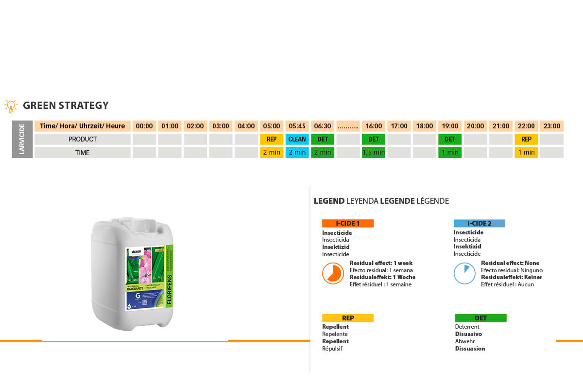 Aplica un insecticida sin efecto residual. El período de aplicación del tratamiento puede variar según la zona geográfica y el área específica. La gestión del tratamiento se realiza fácilmente a través de la Web App, mientras que las operaciones de lavado y Quick Start deben hacerse manualmente.