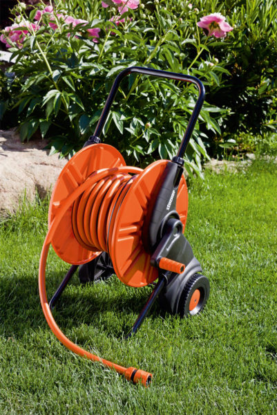 Carro porta manguera ligero con ruedas para tener en orden y despejada el jardín y la terraza.