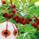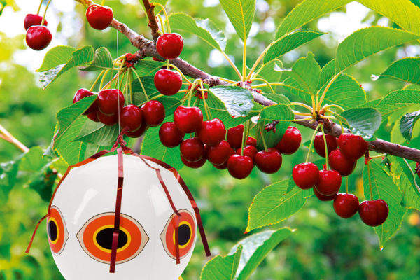 Los dibujos representan los ojos y el pico abierto de un predador, las oscilaciones verticales y laterales del balón y de las cintas plateadas simulan los movimientos asustan las aves no deseadas.