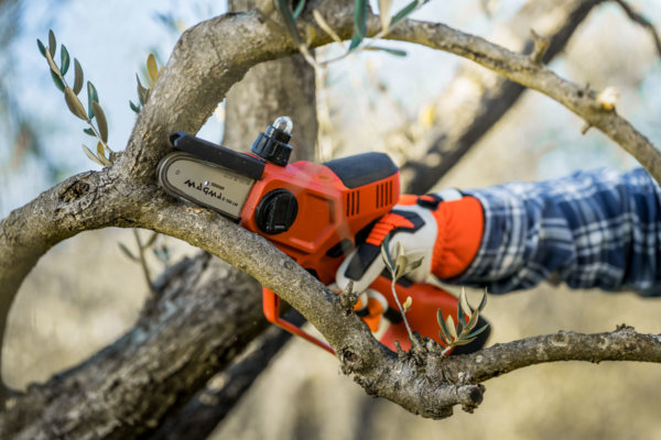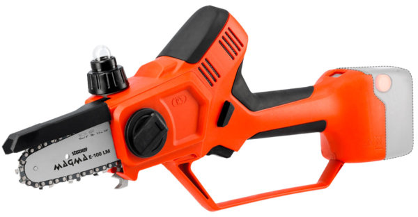 La motosierra Magma E-100 LM 21 V es una motosierra con batería, práctica y funcional. La empuñadura ergonómica y el bajo peso, sólo 1270 g sin batería, reducen el esfuerzo y permiten que el operador no se fatigue la mano.