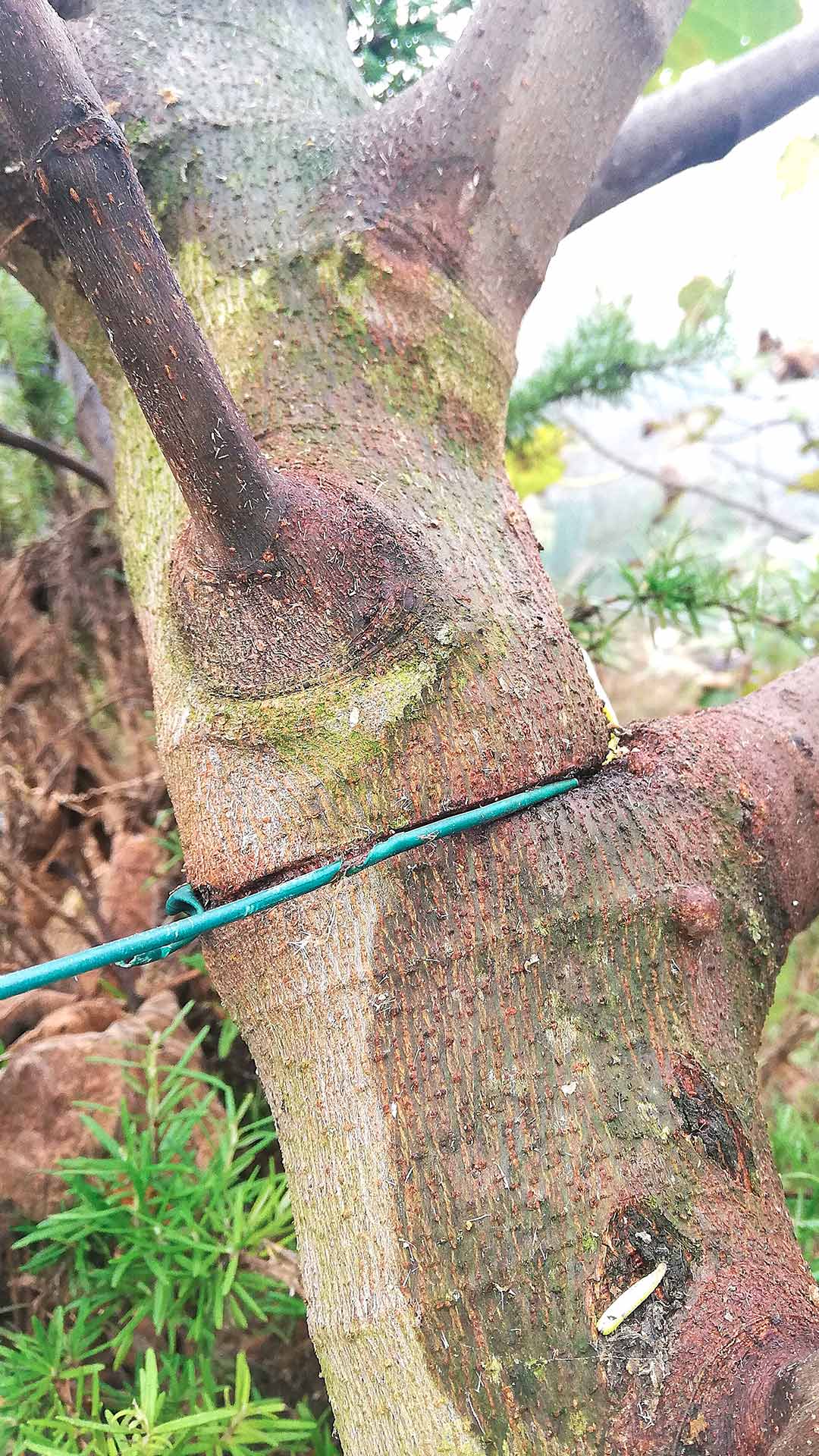 È necessario porre attenzione nel legare fili metallici al fusto, essi non devono stringere. In ogni caso non devono essere a contatto diretto con la corteccia, altrimenti si provocano strozzature nella pianta che ostacolano la circolazione della linfa e quindi la vita stessa della pianta. Le legature per mantenere i rami alla giusta inclinazione devono essere larghe ad anello o fissate preferibilmente a un ramo laterale. Per le legature si usano i fili di plastica che, essendo elastici limitano le eventuali strozzature. Durante la potatura invernale si controlleranno le legature fatte in precedenza, eventualmente tagliando quelle che tendessero a incidere la corteccia.