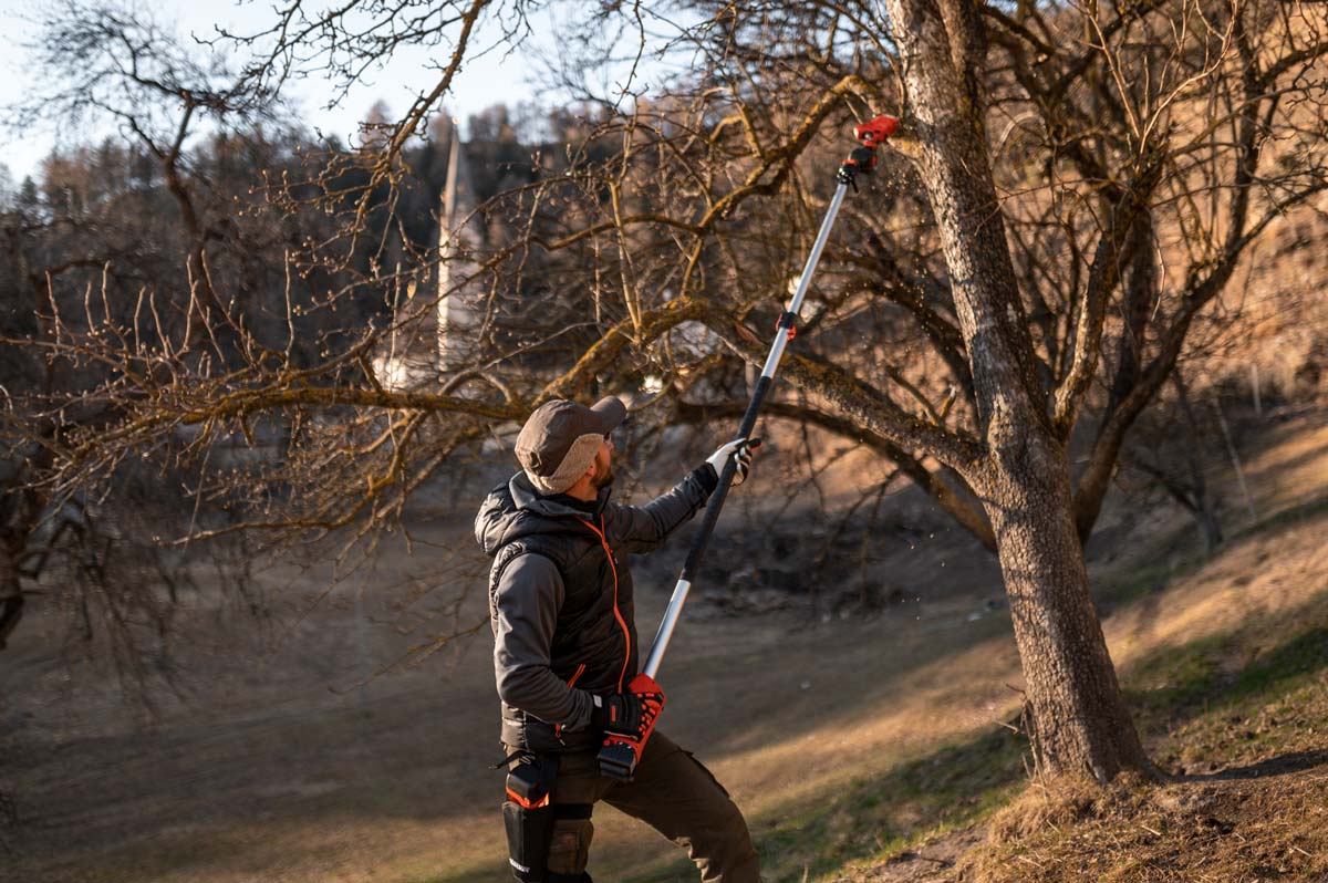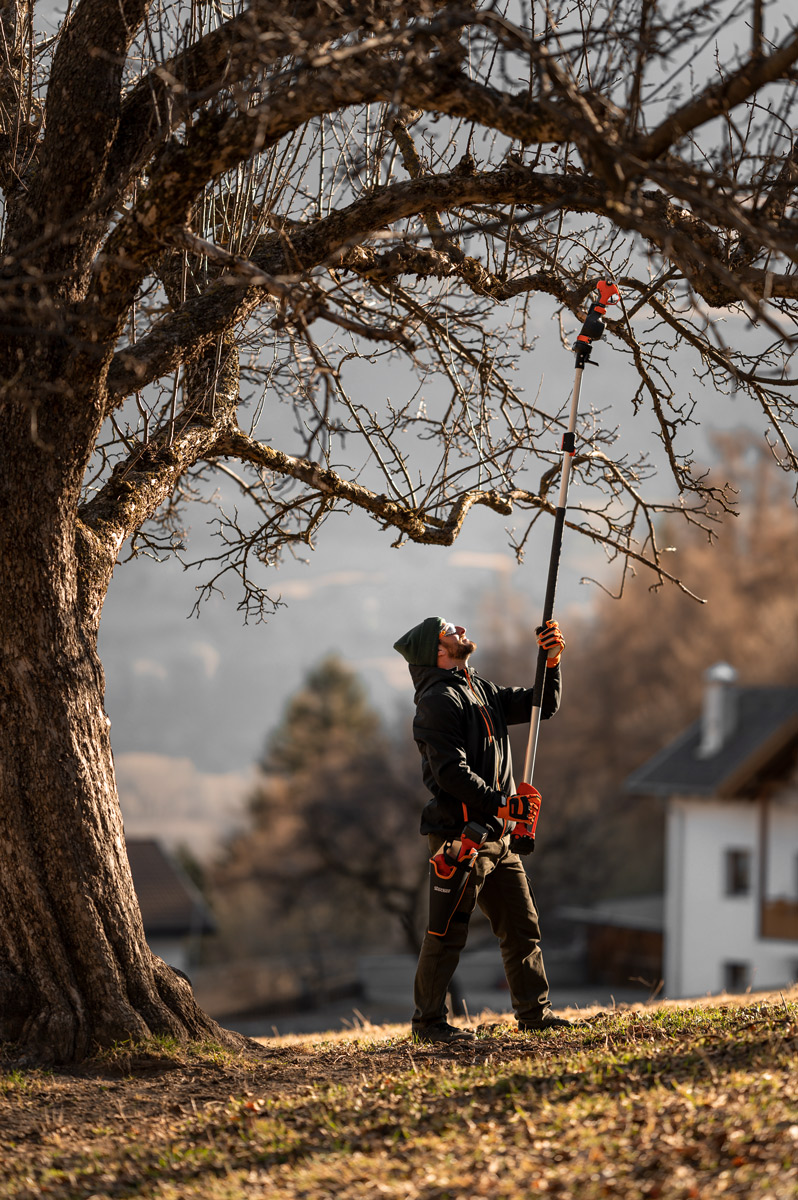 L'operatore potrà quindi potare comodamente da terra azionando l'attrezzo attraverso il grilletto presente sull'impugnatura, che consente di comandarlo facilmente a distanza. Per una maggior sicurezza del potatore, è presente anche una protezione removibile per la mano.