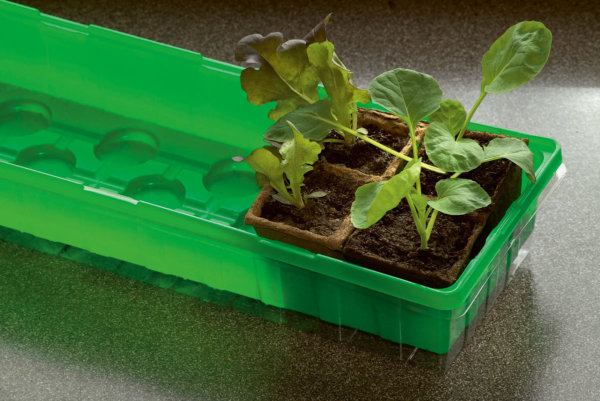 Piccola serra per una facile coltivazione di piante giovani, con vasetti in torba.